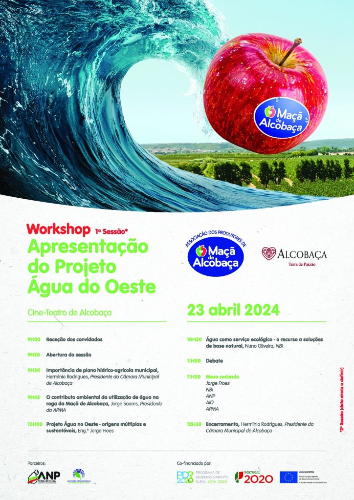 No dia 23 de Abril, às 9h00, no Cine-Teatro de Alcobaça, tem lugar a primeira sessão do workshop “Apresentação do Projecto Água do Oeste”. Este evento é organizado pela Associação dos Produtores de Maçã de Alcobaça (APMA), em parceria com a Câmara Municipal de Alcobaça e com o apoio da Associação Nacional de Produtores de Pêra Rocha (ANP) e da Associação Interprofissional de Horticultura do Oeste (AIHO).