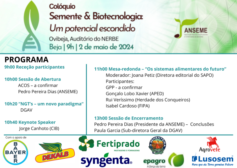 Pode consultar em baixo o programa do colóquio “Semente e biotecnologia: Um potencial escondido”. A inscrição é gratuita, mas obrigatória, podendo ser efectuada aqui.