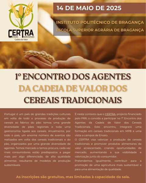 O projecto CERTRA tem como objectivo «valorizar a produção de cereais tradicionais e promover produtos alimentares de valor acrescentado, criando oportunidades de mercado, aumentando a sua visibilidade e valorização junto do consumidor», ao que acresce a intenção de «contribuir para a promoção de uma agricultura mais sustentável e para uma alimentação de qualidade». Pode obter aqui e aqui mais informações sobre este projecto.