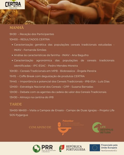 O programa deste evento, que pode consultar em baixo, inclui momentos em sala (como a apresentação dos resultados do projecto CERTRA, uma formação em cereais tradicionais em modo de produção biológico e um debate, entre outros elementos) e, na parte da tarde, uma visita a campos de ensaio. As inscrições são gratuitas, mas obrigatórias, e estão limitadas à lotação da sala, podendo ser efectuadas aqui.