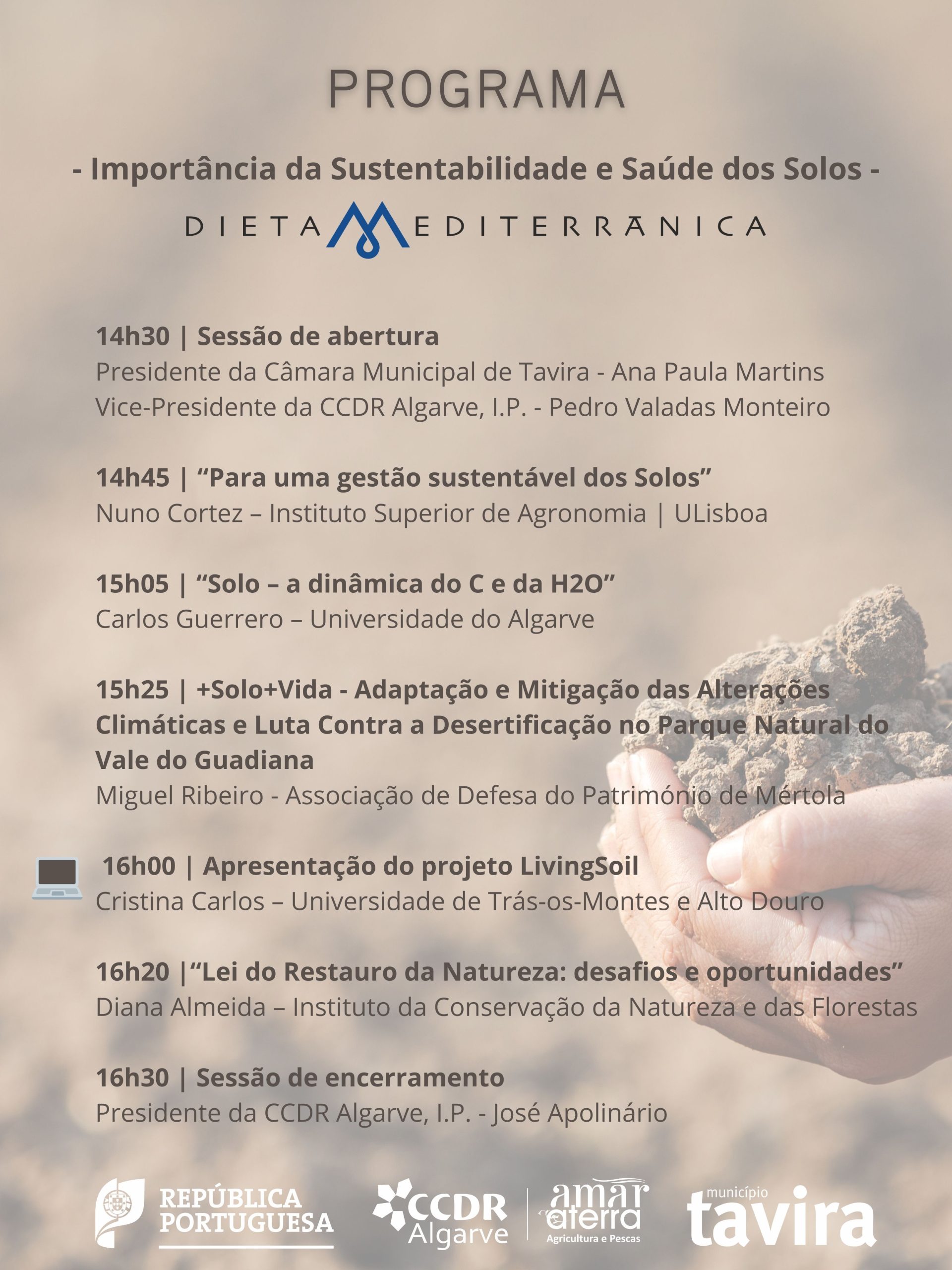 A Comissão de Coordenação e Desenvolvimento Regional (CCDR) do Algarve, I.P. promove, no dia 5 de Setembro (quinta-feira), pelas 14h30, o seminário “Importância da Sustentabilidade e Saúde dos Solos”, que decorrerá no Centro de Experimentação Agrária de Tavira, no âmbito da X Feira da Dieta Mediterrânica.