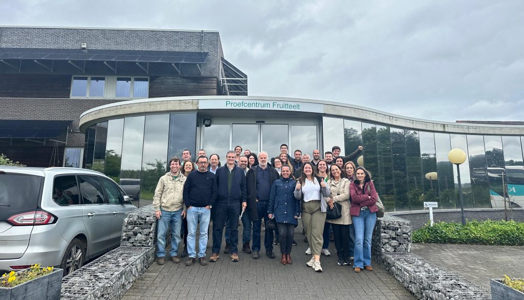 No segundo dia, a comitiva visitou o pcfruit (Proefcentrum Fruitteelt) [imagem de abertura], onde ficaram a conhecer este centro de investigação em fruticultura e as suas principais áreas de estudo, tendo também visitado os campos de ensaios de pequenos frutos e de pomóideas. Em comunicado, os promotores do Demo.net explicam que «foram apresentados pelos investigadores da pcfruit alguns resultados dos estudos que têm vindo a realizar para o controlo das principais pragas e doenças, tecnologias de produção, agricultura de precisão, entre outras linhas temáticas», sendo salientado que «todo o trabalho de investigação desenvolvido assenta num trabalho de proximidade com técnicos e agricultores, para se perceber quais as temáticas mais importantes a investigar, e num modelo de financiamento privado, que garante proximidade entre estruturas técnicas e investigação, altamente focado na inovação, competitividade e transferência de conhecimento».