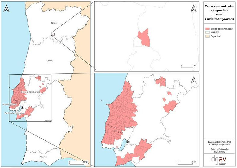 A Direcção Geral de Alimentação e Veterinária (DGAV) publicou o Despacho n.º 158/G/2025, que procede à actualização das Zonas Demarcadas para Erwinia amylovora, a bactéria responsável pela doença conhecida como fogo bacteriano. O documento indica as zonas contaminadas (referindo as freguesias com presença detectada da bactéria) e as medidas de contenção aplicáveis nos termos e para os efeitos estabelecidos nos artigos 3.º e 4.º da Portaria n.º 308/2021, na sua redação actual.