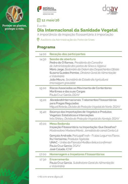 O Auditório da Administração do Porto de Sines recebe no dia 12 de Maio um simpósio subordinado ao tema «A importância da inspecção fitossanitária à importação». O simpósio tem início às 14h30 e é organizado pela Direcção Geral de Alimentação e Veterinária (DGAV) para celebrar o Dia Internacional da Sanidade Vegetal.