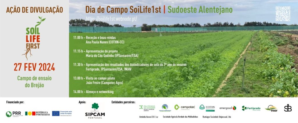 No dia 27 de Fevereiro, a partir das 11h00, realiza-se no Brejão, no Sudoeste Alentejano, um dia de campo do projecto “SoiLife1st – Adaptação de sistemas produtivos em contexto de alterações climáticas”. Nesta iniciativa serão apresentados resultados referentes aos bioindicadores de solo durante o primeiro ano de ensaios e será feita uma visita ao campo piloto.