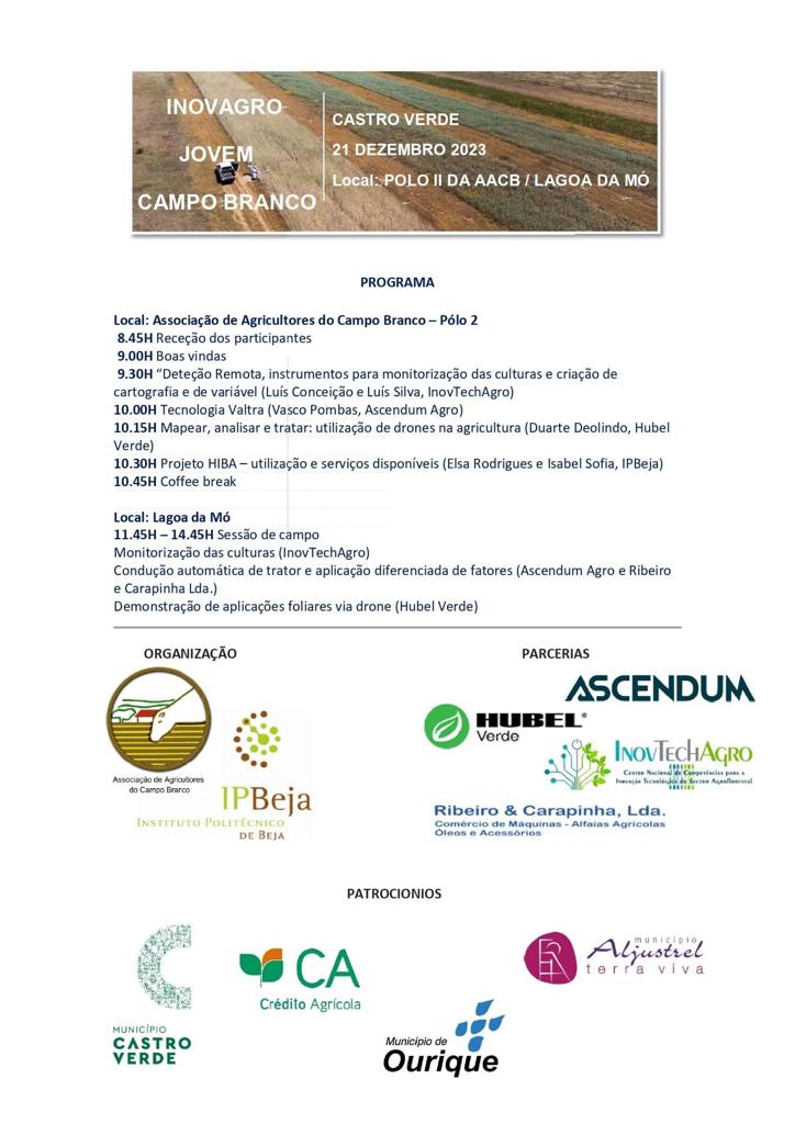 Decorre na manhã do dia 21 de Dezembro, em Castro Verde, o evento “Inovagro Jovem Campo Branco”, dedicado aos temas da agricultura de precisão e da digitalização. Este evento é organizado pela Associação de Agricultores de Campo Branco e pelo Instituto Politécnico de Beja e destina-se a pessoas com menos de 40 anos.