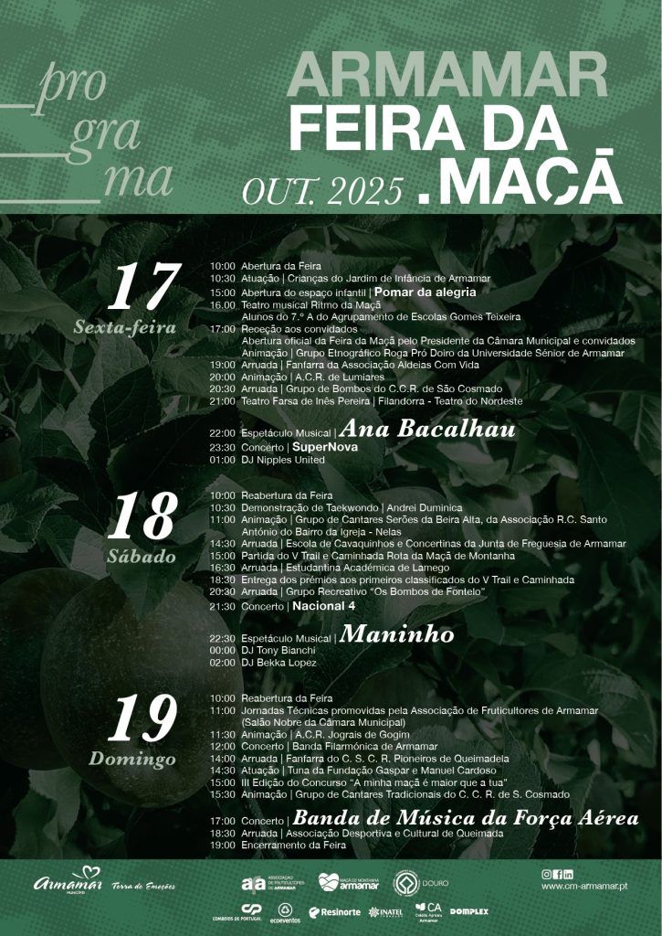 A cidade de Armamar acolhe a edição de 2025 da Feira da Maçã nos dias 17, 18 e 19 de Outubro. Este evento procura reunir produtores, visitantes e amantes da maçã de montanha e inclui uma mostra da produção agrícola, da gastronomia e da cultura locais, bem como concertos e outros espectáculos, provas desportivas, jornadas técnicas e momentos de animação.