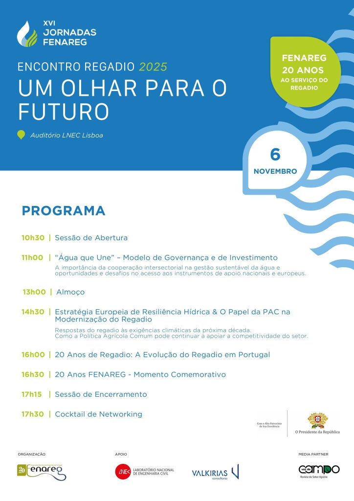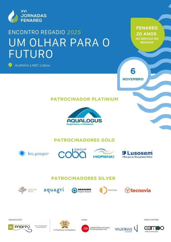Decorre a 6 de Novembro, no Auditório do LNEC, em Lisboa, a 16.ª edição das Jornadas Fenareg | Encontro Regadio 2025, organizado pela Federação Nacional de Regantes de Portugal (Fenareg). Subordinado ao tema “Regadio: um olhar para o futuro”, este evento tem início às 10h30, conta com o Alto Patrocínio do Presidente da República e está integrado nas celebrações do 20.º aniversário da Federação.