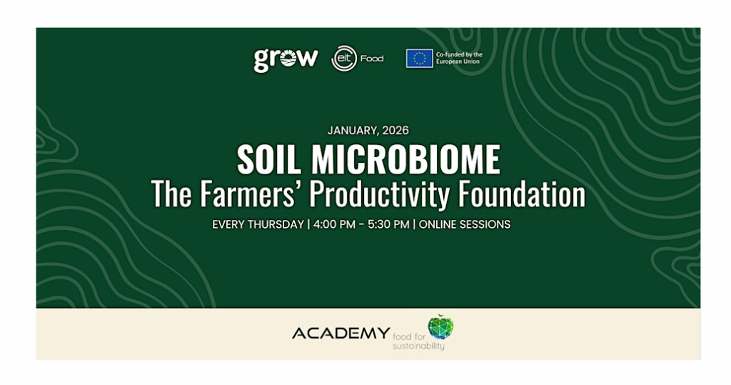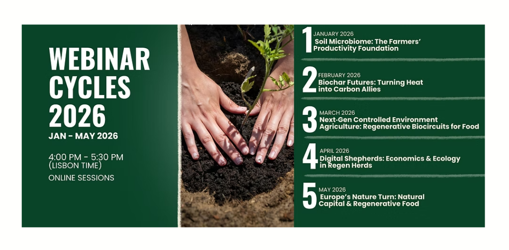 Entre Janeiro e Maio de 2026, o Food4Sustainability Academy e o programa Grow vão organizar uma série de webinars dedicada à agricultura regenerativa e aos sistemas alimentares sustentáveis. Segundo a organização, «nesta série, especialistas em microbiologia, tecnologias agrícolas e sustentabilidade irão explorar soluções práticas e inovadoras que promovem a saúde do solo, aumentam a produtividade das culturas e incentivam práticas agrícolas resilientes e regenerativas».