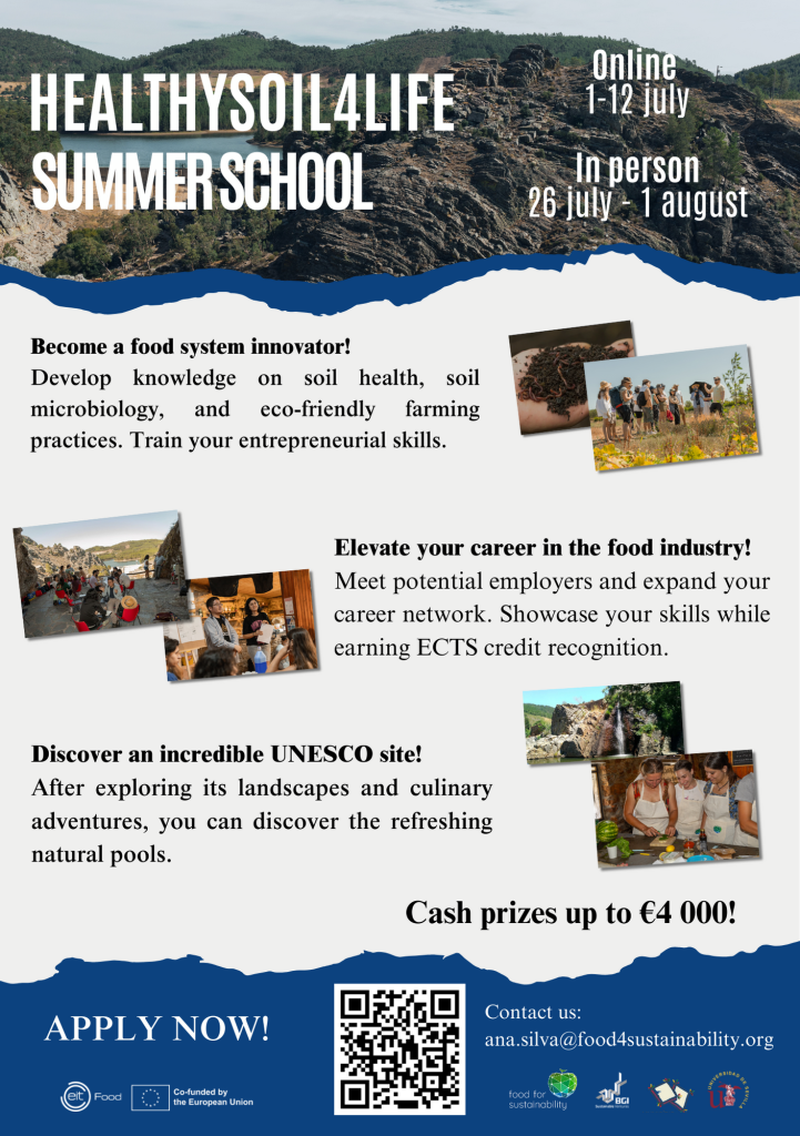 A “HealthySoil4Life Summer School” é promovida no âmbito do programa RIS Inspire – HealthySoil4Life, uma iniciativa educacional copatrocinada pelo EIT Food e que visa promover o empreendedorismo e a inovação na saúde do solo e na alimentação. O Food4Sustainability é uma das entidades envolvidas na organização deste evento, sobre o qual pode obter mais informações aqui e no qual os interessados se podem inscrever aqui.