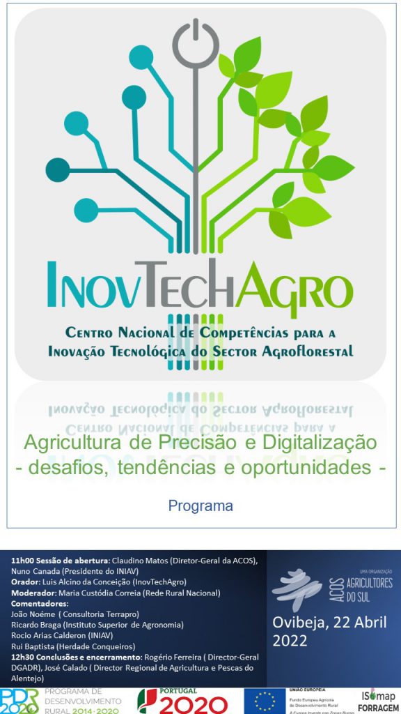 “Agricultura de precisão e digitalização – desafios, tendências e oportunidades” é o tema da conferência que o InovTechAgro – Centro Nacional de Competências para a Inovação Tecnológica do Sector Agroflorestal promove em Beja na manhã do dia 22 de Abril, a partir das 11h00. Este evento, cujo programa encontra mais abaixo, terá lugar no âmbito da edição de 2022 da Ovibeja, feira agrícola que decorre no Parque de Feiras e Exposições de Beja entre 21 e 25 de Abril, com organização da Associação de Agricultores do Sul (ACOS).