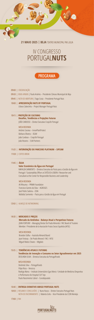 O congresso está organizado em quatro painéis (“Protecção de culturas – Desafios, tendências e projecções futuras”, “Água – Valor económico da água em Portugal”, “Mercados e preços – Mercado da amêndoa – Balanço actual e perspectivas futuras”, “Tendências actuais e futuras – Tendências de inovação e consumo no sector agroalimentar em 2025”), compostos por uma apresentação e, em seguida, uma mesa-redonda. Pode consultar mais em baixo o programa completo do IV Congresso Portugal Nuts e os interessados em participar neste evento podem inscrever-se aqui.