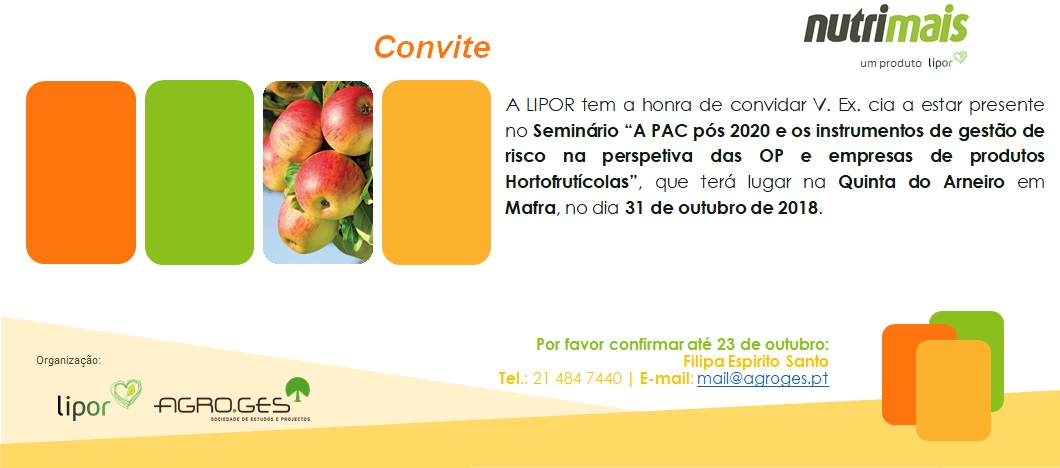 A Lipor organiza o Seminário “A PAC pós 2020 e os instrumentos de gestão de risco na perspectiva das OP e empresas de produtos hortofrutícolas”, que terá lugar em Mafra, na Quinta do Arneiro, no dia 31 de Outubro.