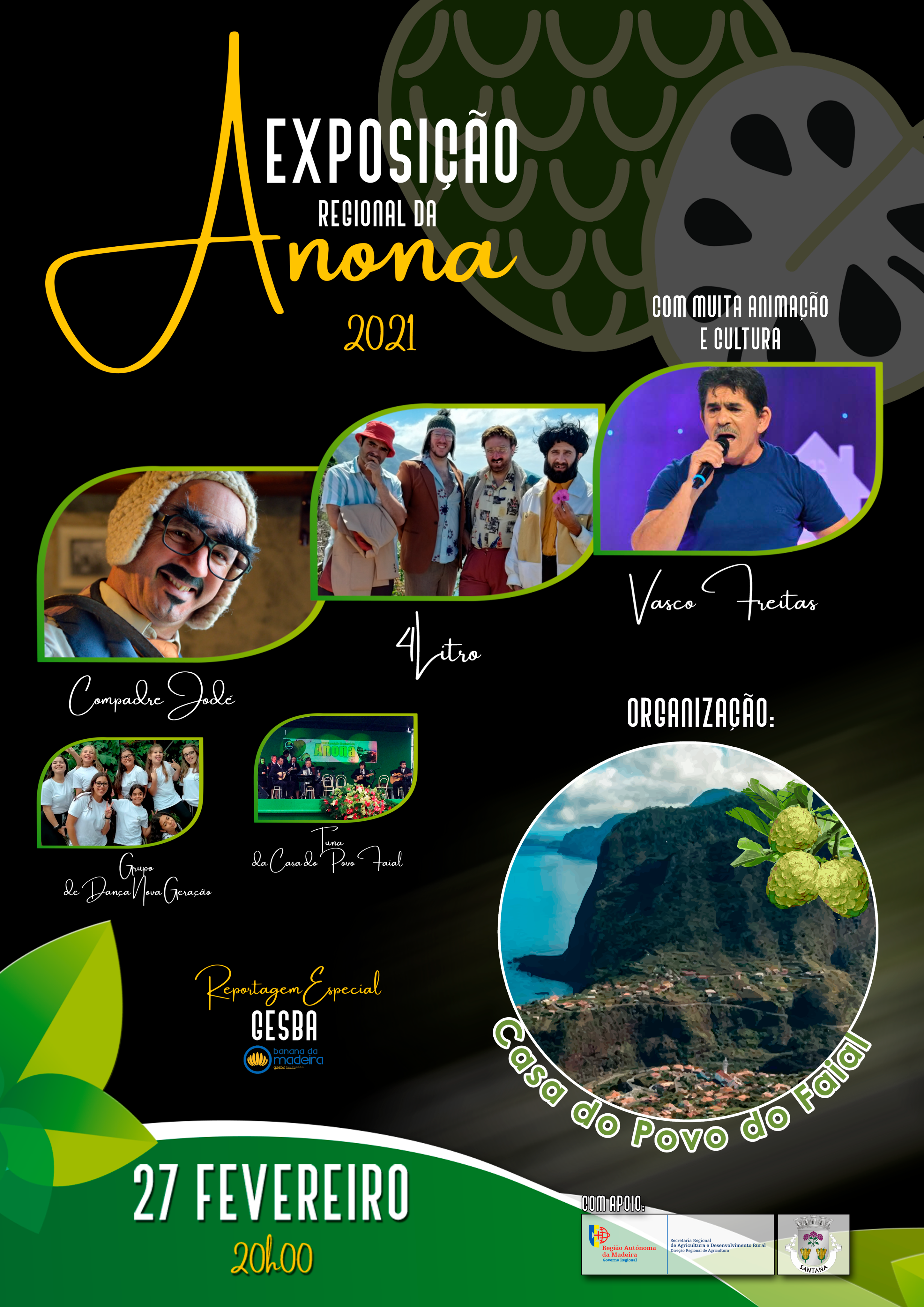 A Exposição Regional da Anona, que habitualmente decorre na freguesia do Faial, na ilha da Madeira, tem lugar este ano em formato online, a 27 de Fevereiro. O evento visa a «promoção e valorização da anona e seus derivados» e é organizado pela Casa do Povo do Faial, com a colaboração do Governo Regional da Madeira – nomeadamente o apoio da Secretária Regional da Agricultura e Desenvolvimento Rural e da Câmara Municipal de Santana – e da Gesba – Empresa de Gestão do Sector da Banana.