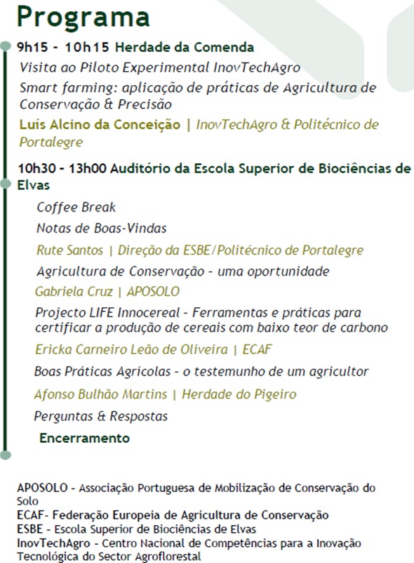 A Associação Portuguesa de Mobilização de Conservação do Solo (Aposolo), a ECAF – Federação Europeia de Agricultura de Conservação e a Sociedade Agrícola da Herdade do Pigeiro organizam a 6 de Maio uma “Manhã de Campo” dedicada ao projecto europeu InnoCereal. Este evento tem início às 9h15 e decorre em dois locais: primeiro na Herdade da Comenda (https://maps.app.goo.gl/hG4QULjzkgEhtJrV8) e depois no Auditório da Escola Superior de Biociências de Elvas (ESBE) (https://maps.app.goo.gl/Fxmwn2WNzsb7cn4t6).