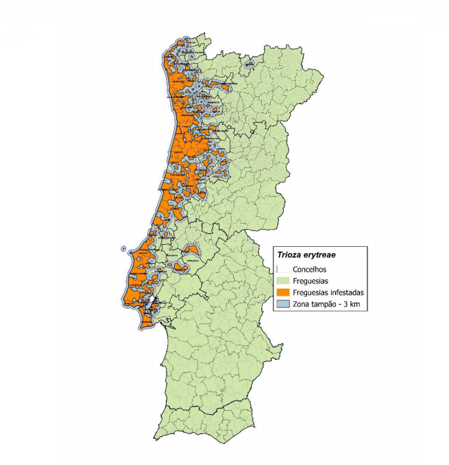 A Direcção Geral de Alimentação e Veterinária (DGAV) publicou o Despacho n.º 17/G/2021, de 19 de Maio, que procede à actualização da zona demarcada para a praga de quarentena Trioza erytreae. Este documento actualiza a zona demarcada para a Trioza erytreae em Portugal, integrada pela lista das freguesias infestadas, das freguesias totalmente abrangidas pela zona tampão e das freguesias parcialmente abrangidas pela zona tampão, bem como o mapa da zona demarcada.