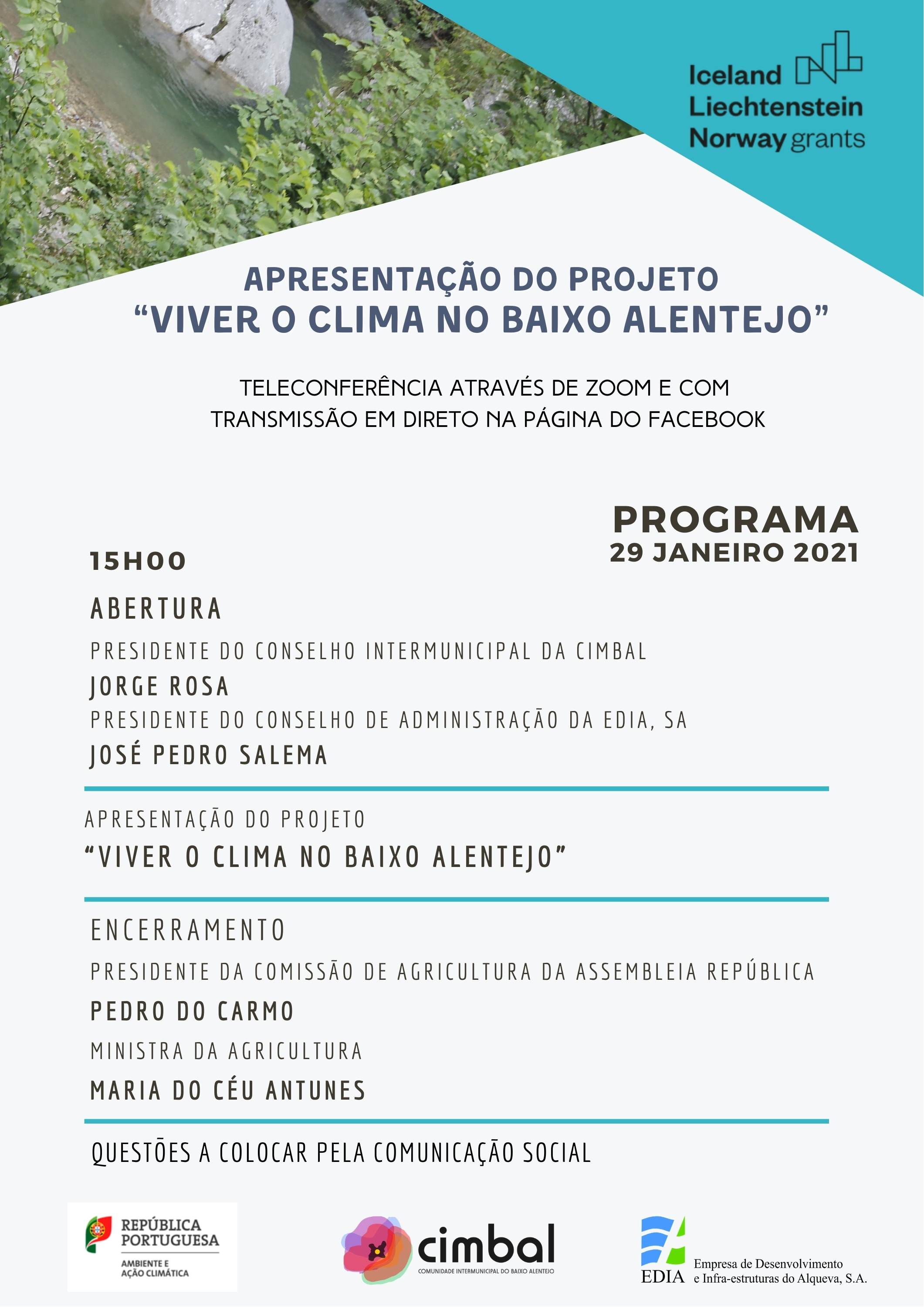 Dia 29 de Janeiro, a partir das 15h00, decorre uma apresentação online do projecto “Viver o clima no Baixo Alentejo”. Esta iniciativa visa a implementação de medidas concretas de adaptação às alterações climáticas nos oito concelhos (Aljustrel, Alvito, Beja, Cuba, Ferreira do Alentejo, Moura, Serpa e Vidigueira) que simultaneamente integram a Comunidade Intermunicipal do Baixo Alentejo (CIMBAL) e se inserem na área de influência do Empreendimento de Fins Múltiplos de Alqueva (EFMA).