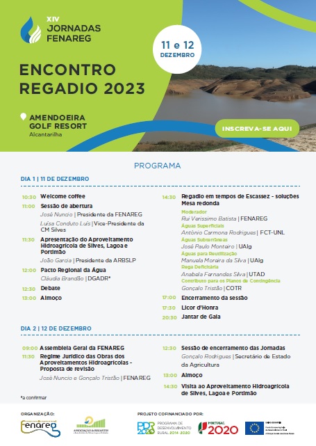 O Encontro do Regadio 2023 – XIV Jornadas da Fenareg vai decorrer a 11 e 12 de Dezembro, em Alcantarilha, no Hotel Amendoeira Golfe Resort. O evento é organizado pela Fenareg –Federação Nacional de Regantes de Portugal, em colaboração com a Associação de Regantes e Beneficiários de Silves, Lagoa e Portimão.