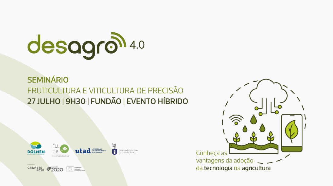 Este seminário envolve uma palestra técnica sob o tema “Fruticultura e viticultura de precisão” – por Ricardo Braga, coordenador científico do projecto DesAgro 4.0, investigador e professor no Instituto Superior de Agronomia da Universidade de Lisboa –, apresentações de produtos e serviços na área da agricultura de precisão para as fileiras frutícola e vitícola e uma mesa redonda de investigadores sobre as vantagens da digitalização das explorações agrícolas. Pode consultar aqui o programa do evento e pode fazer a inscrição – gratuita, mas obrigatória – no site do projecto ou, em alternativa, (formato presencial) ou (formato virtual).