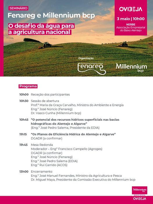 No dia 3 de Maio, entre as 10h00 e as 13h00, a Federação Nacional de Regantes de Portugal (Fenareg) e o Millennium bcp realizam um seminário dedicado ao tema “O desafio da água para a agricultura nacional”. Este evento decorre no auditório do NERBE, no Parque de Feiras e Exposições de Beja, no âmbito da 40.ª edição da Ovibeja, certame que tem lugar de 30 de Abril a 5 de Maio em Beja.