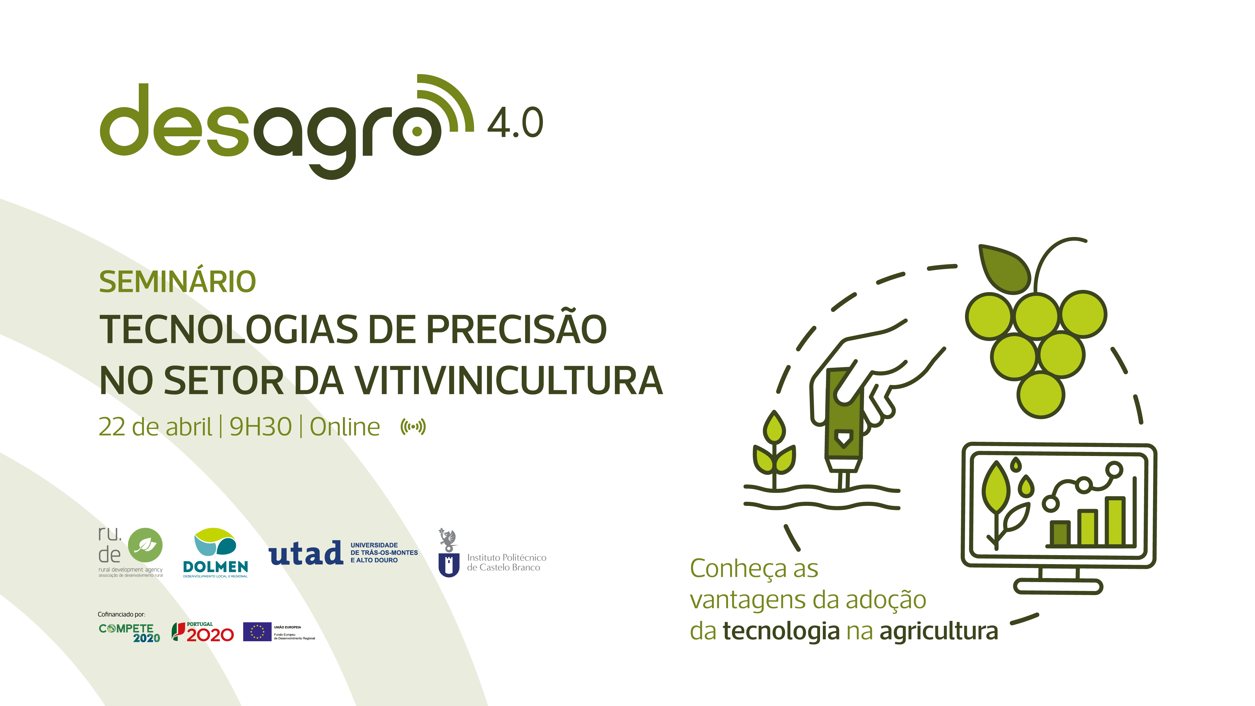 Os interessados em participar no seminário virtual “Tecnologias de precisão no sector da vitivinicultura”, cujo programa pode ser consultado aqui, devem fazer a sua inscrição – que é gratuita, mas obrigatória – no site do projecto Desagro 4.0 ou directamente . Cofinanciado pelo Fundo Europeu de Desenvolvimento Regional, no âmbito do Sistema de Apoio a Acções Colectivas do Programa Operacional Competitividade e Internacionalização, o projecto Desagro 4.0 resulta de uma parceria entre a Rude – Associação de Desenvolvimento Rural, a Dolmen – Cooperativa de Desenvolvimento Local e Regional, a Universidade de Trás-os-Montes e Alto Douro e o Instituto Politécnico de Castelo Branco.