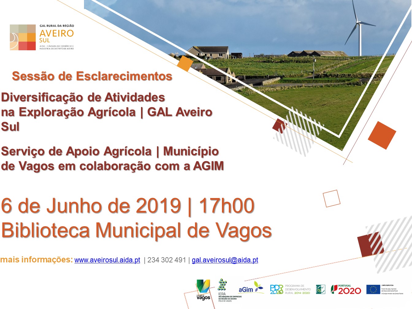 A Biblioteca Municipal de Vagos recebe, a 6 de Junho, pelas 17h00, uma sessão de esclarecimento sobre a apresentação de candidaturas à tipologia de apoio “Diversificação de actividades na exploração agrícola” e sobre o Serviço de Apoio Agrícola. Esta palestra é promovida pelo GAL Aveiro Sul, no âmbito da sua “Estratégia de Desenvolvimento Local DLBC/Leader”, em parceria com a Câmara Municipal de Vagos e a AGIM – Associação para os Pequenos Frutos e Inovação Empresarial.
