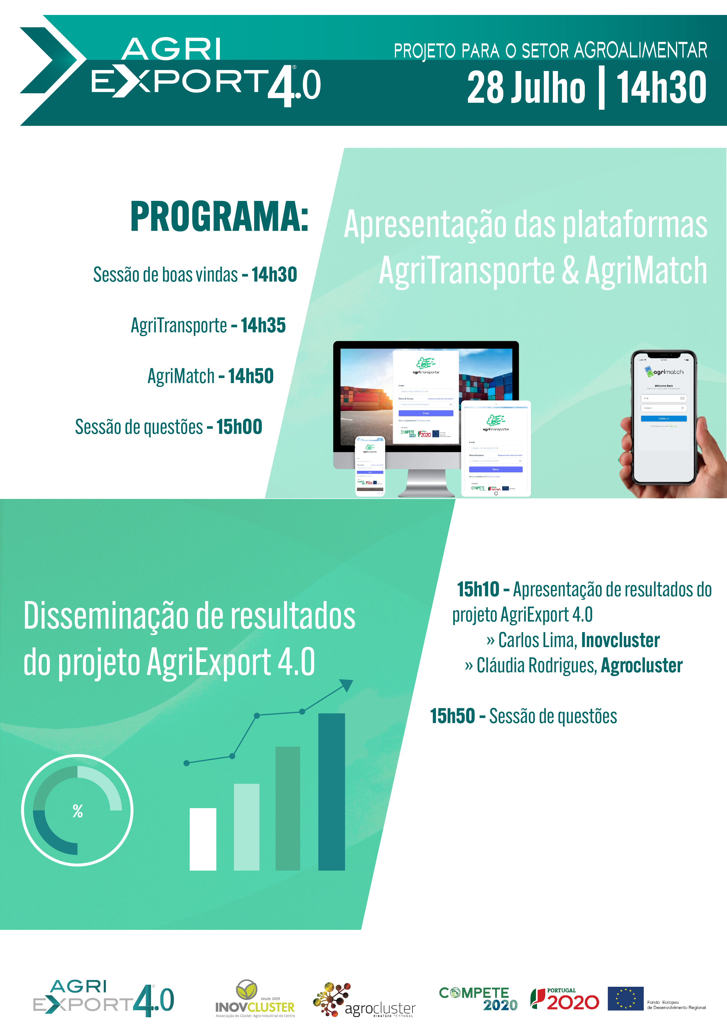 Na tarde de 28 de Julho, a partir das 14h30, tem lugar a sessão de disseminação de resultados do projecto AgriExport 4.0. Este evento realiza-se em formato online, através da plataforma Zoom, e visa «dar a conhecer às empresas agroalimentares nacionais as acções desenvolvidas no projecto e as oportunidades de negócio identificadas nos mercados externos abordados».