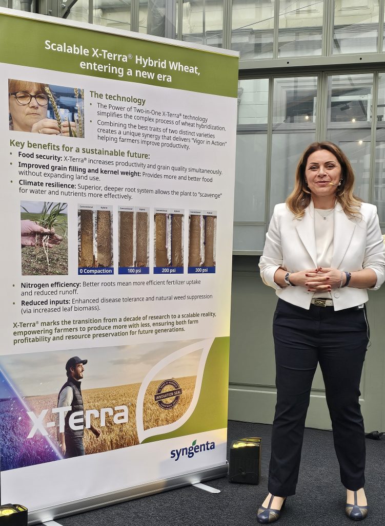 A empresa também apresentou a «primeira variedade de trigo híbrido», designada X-Terra, que vai lançar este ano em França, com a Syngenta a garantir que estas variedades «são mais produtivas e têm melhor qualidade de grão do que o trigo convencional». «Graças ao seu sistema radicular mais forte, com 60% mais biomassa do que uma variedade convencional, o trigo X-Terra tem maior capacidade de absorver água e nutrientes nas camadas mais profundas do solo. A parte aérea da planta também é mais vigorosa, conferindo-lhe maior resistência às doenças e maior capacidade de competir com as infestantes. O enchimento da espiga é optimizado e o peso dos grãos é superior nas variedades híbridas», diz a empresa. A propósito deste anúncio, Anne Azam (na imagem em cima), directora-geral da Syngenta em França, comentou que «o trigo X-Terra surge após mais de uma década de investigação, permitindo aos agricultores produzir mais com menos factores de produção, garantindo rentabilidade e a preservação dos recursos naturais para as gerações futuras».