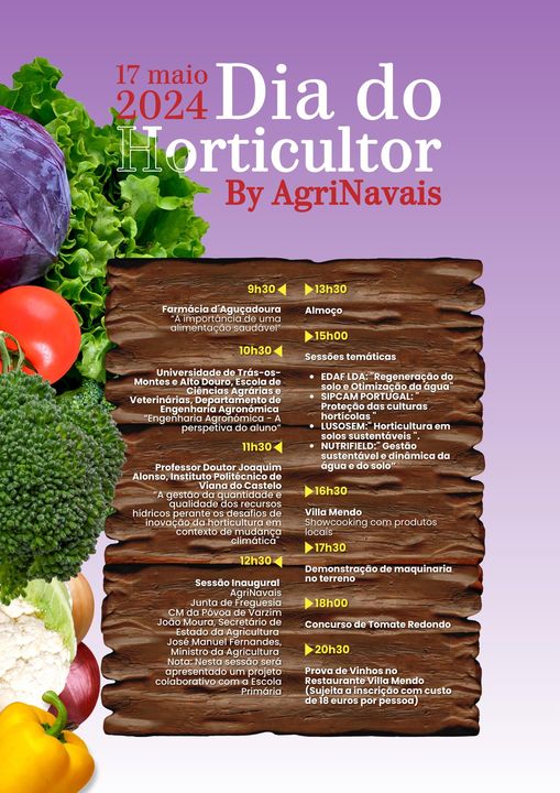 Entre as 9h30 e as 19h00 do dia 17 de Maio, decorre em Navais, na Póvoa do Varzim, a terceira edição do “Dia do Horticultor by AgriNavais”. Este evento é organizado pela empresa AgriNavais e conta com palestras e apresentações sobre temas relacionados com a horticultura, além de showcooking e de um concurso de tomate redondo, tendo ainda associada uma prova de vinhos.