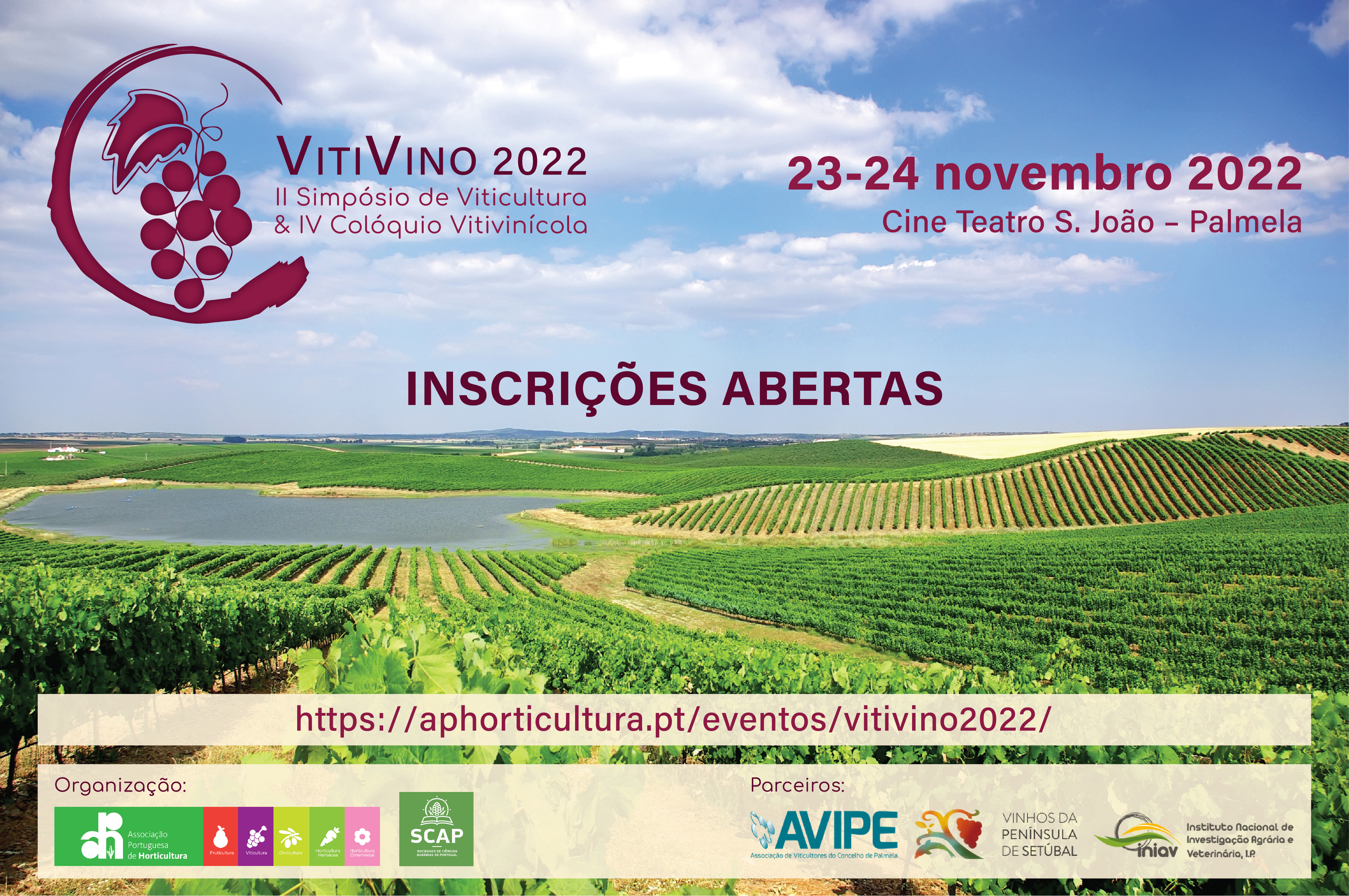 Nos dias 23 e 24 de Novembro, o Cineteatro São João, em Palmela, vai ser o palco do VitiVino 2022, evento que agrega o II Simpósio de Viticultura e o IV Colóquio Vitivinícola, da Associação Portuguesa de Horticultura (APH), e que tem o objectivo de contribuir para «a melhoria da vitivinicultura, com mais ciência, mais conhecimento e mais inovação». O VitiVino é organizado pela APH e pela Sociedade das Ciências Agrárias de Portugal (SCAP), em parceria com a Associação de Viticultores do Concelho de Palmela (AVIPE), a Comissão Vitivinícola Regional da Península de Setúbal (CVRPS) e o Instituto Nacional de Investigação Agrária e Veterinária (INIAV).