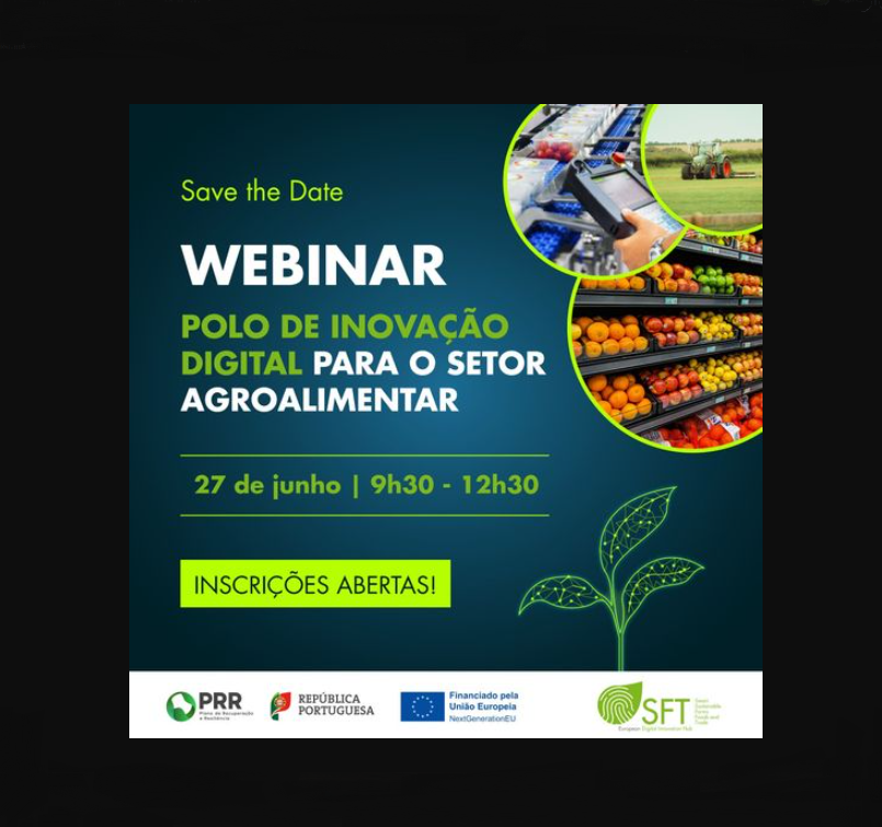 Na manhã do dia 27 de Junho, das 9h30 às 12h30, realiza-se o webinar “Pólo de inovação para o sector agroalimentar”, através da plataforma Zoom. Este evento online pretende dar a conhecer o Smart Sustainable Farms Foods and Trade (SFT-EDIH), definido como «um pólo de inovação para o sector agroalimentar», e é organizado por BGI – Sustainable Ventures, Food4Sustainability CoLab, Associação Portuguesa de Empresas de Distribuição (APED), Federação das Indústrias Portuguesas Agro-Alimentares (FIPA) e Confederação Nacional das Cooperativas Agrícolas e do Crédito Agrícola de Portugal (Confagri).